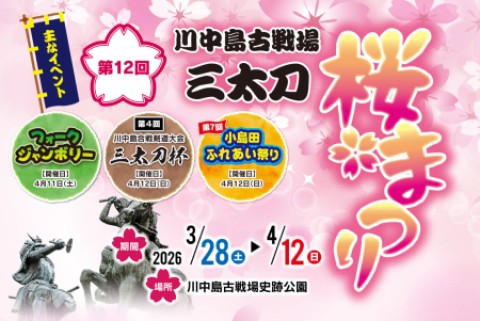 トップページ 2025.12.172026.03.14 新着情報 会場案内を更新 会場案内を更新しました。会場案内図、受付、メインステージ、サブステージ(A/B)の写真を公開します。一部、生成AIによるイメージもありますが参考にしてください。KKFJ実行委員会 2026.03.13 タイムテーブルを公開しました メインステージ、サブステージ(A/B)別にタイムテーブルを公開します。お友だちを誘って、桜満開の川中島古戦場史跡公園まで是非お出かけください。広い公園内で音楽に包まれながら春の一日をお楽しみください。フード、ドリンクコーナーも設置される予定... 2026.03.13 共催・協賛事業所を更新 川中島古戦場フォークジャンボリー2026の開催にあたり、共催いただきました団体及び協賛いただきました事業所・団体をご紹介します。関係者の皆様のご理解・ご支援に心から感謝を申し上げます。ありがとうございました。一覧はHOME画面下部をご覧くだ... 2026.03.09 出演順の通知(メール) 開催まで約1カ月となりました。出演者の皆さま、準備は順調に進んでいるでしょうか。本日、出演者全員に出演順を通知しました(メール)。内容を確認願います。メールが届かない方は、事務局までご連絡ください。KKFJ実行委員会 2026.03.02 キャンセル待ちの申込フォーム(お知らせ) 出演申込が予定数に達したため、申込みを締切りましたが、お問合せがありましたので「キャンセル待ち」の申込方法をお知らせします。以下の項目に沿って、内容を入力の上メールでお送りください。宛先 takuroage2011@gmail.comなお、... 2026.01.31 情報全表示 クラウドファンディング 「CAMPFIRE クラウドファンディング」を企画しました。「川中島古戦場フォークジャンボリー」の成功を願い皆様のご支援をよろしくお願いいたします。【支援金の使い道】集まった支援金は以下に使用する予定です。・設備費・広報/宣伝費※目標金額を超えた場合はプロジェクトの運営費に充てさせていただきます。 CAMPFIRE クラウドファンディングへ 川中島古戦場フォークジャンボリー2026 ポスター 共催・後援・協賛 共催 川中島古戦場三太刀桜まつり 後援 公益財団法人長野県長寿社会開発センター 協賛 川中島古戦場三太刀桜まつり 株式会社 神龍 株式会社 綿半インテック いろは堂 ワシらのフォーク村 拓郎age